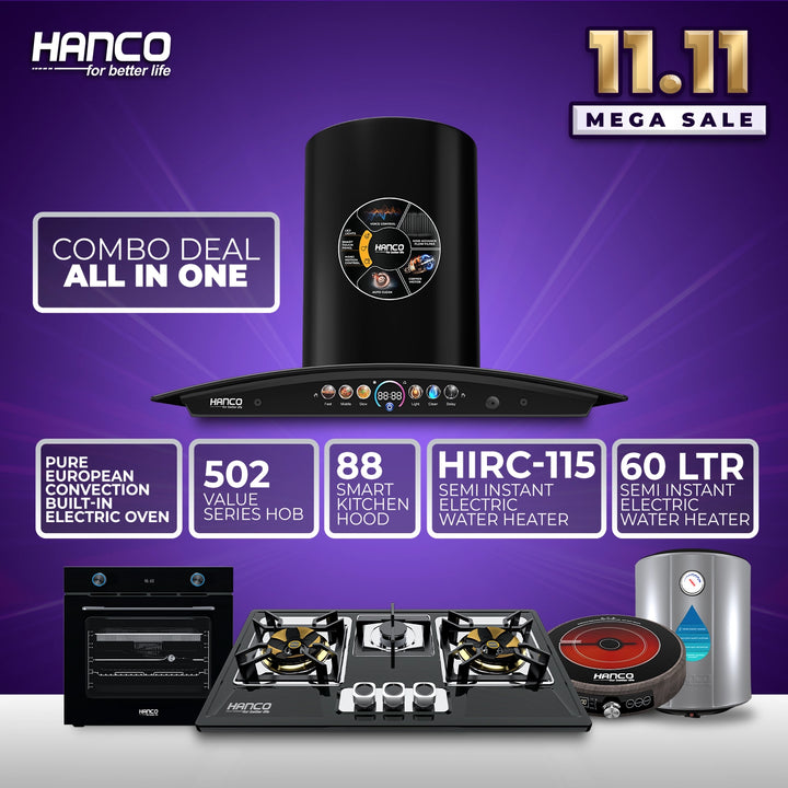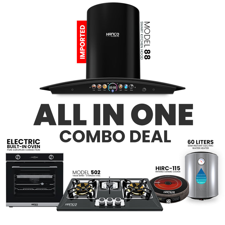 - Hood Model HDE-88 + Hob Model 502 +Pure European Convection Built-in Electric Oven (Black & Silver) + 60Liter Electric Geyser + Hirc-115